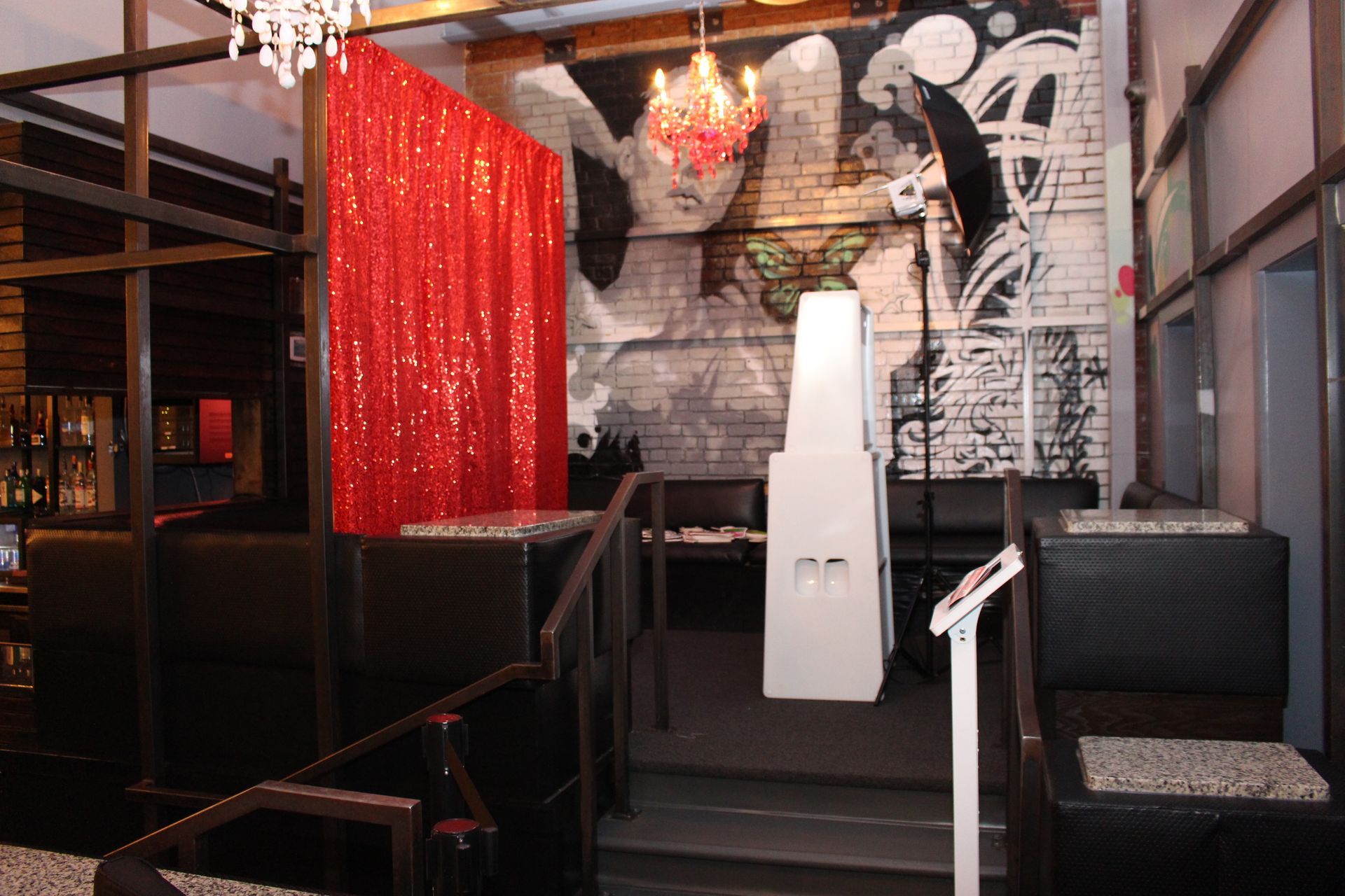Above is our printing photo booth with a single color sequin backdrop.
